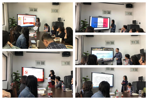 国歌是国家的重要象征,纵览世界各国国歌,无一不承载着各国人民最珍视的精神。主题党日活动的第二个内容是由各系老师分别介绍俄罗斯、德国和法国的国歌。