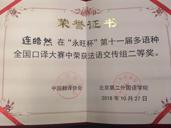 连皓然与来自南京大学,北京外国语大学,广东外国语大学,上海外国语大学等13所高校的选手展开激烈竞争。比赛以交替传译的形式进行,包含法译中和中译法两个部分,内容涵盖多个领域,从职业素养、技巧运用、信息传达等多方面考察参赛选手的综合水平。在紧张的角逐中,连皓然的表现沉着镇定、翻译精确到位,受到评委与观众的好评,最终斩获二等奖。