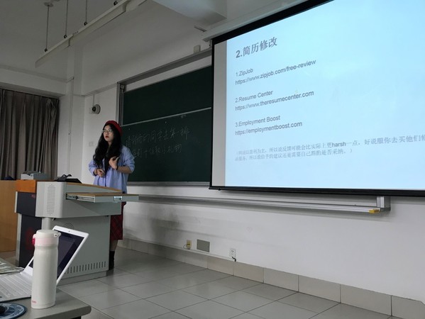林江珊学姐首先教大家如何进行实习和招聘信息检索,包括关注高校官网发布的宣讲会,以及一些公众号和常用的实习和招聘信息网址。接着,她分享了国内外帮助大家修改简历的知名网站,并提了几点如何更好地撰写并投递简历的建议,比如;突出自己的个性化的经历和技能,将自己参与过、举办过的活动和项目立体化;并根据职位的类别编辑和调整自己的简历,不能一稿多投等等。然后,她向大家详细讲述了各类笔试、面试的种类,指导大家如何更充分地做好相应的准备。最后,江珊学姐分享了自己的几点体会:比如确定好自己的目标,尽早做好自己的人生规划;刚毕业时选择相对更大的平台,可以接触更完备的制度,受到更好的培训;保持良好的心态,永远持有求知欲,坚持自己的兴趣和专长等等。