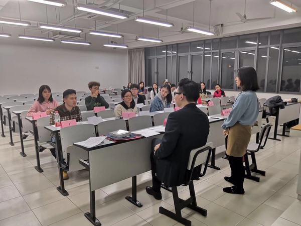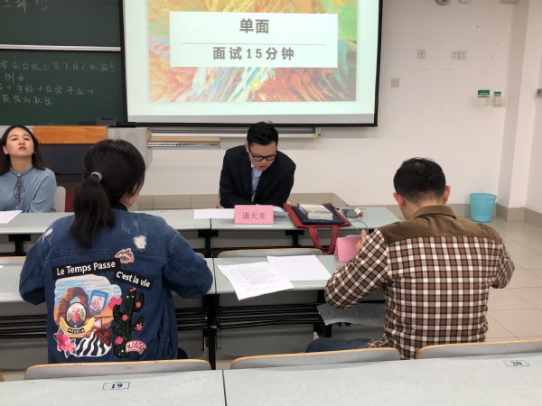 模拟面试分为单面和群面两大部分,在单面部分中,第一位同学面试的是公司的客户发展部,诸天龙要求其做了中文和英文的自我介绍,随后分别从该同学实习经历对自己的工作经验的帮助、对自己所面试的这份工作的理解以及当实际工作与客户需求发生矛盾时应如何处理等方面提出了一些富有挑战性的问题,第二位同学则面试的是高中英语教师,面试官们也相应地针对教育方面提出了一些问题。在打分和点评环节中,学长学姐们指出了同学们简历中应当注意要修改的地方以及真正面试时应当注意的姿态、谈吐、表情以及提前的准备等问题,使参与者和围观者都受益匪浅。