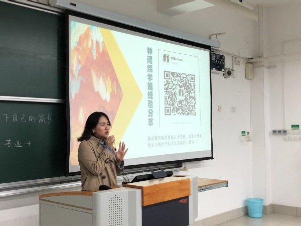 钟雨嫣首先简要地向我们介绍了求职市场情况,身为一位学习语言专业的员工我们应该如何提升自己就业的竞争力等,与此同时,她介绍了我们在准备实习之前,还应当归纳和总结学长学姐的实习经验,如何进行尝试。最后,她向我们介绍了自己的求职经历以及对面试技巧应该如何培养提出了一些建议。