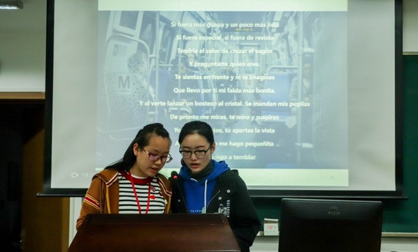 随后上场的是来自大一的选手。在第一阶段的西语歌曲演唱和诗歌朗诵环节,同学们各尽所能,深情演绎了动人的歌曲和诗歌。第二轮的单词朗读个人赛,则考察了西班牙初学者对语音语调的掌握情况。尽管大一新生们才刚刚学了两个月的西班牙语,但却毫不怯场,纷纷展现出最佳风采。最终,程泽韵同学和阳昕同学表现出色,获得了“最佳个人奖”。随后则是最为紧张刺激的绕口令环节,要求两个队伍在90秒时间内读对尽量多的西语绕口令。员工们的认真和专注使得这一环节的完成度超出了评委们的预期。最终“podemos队”取得了团体胜利。