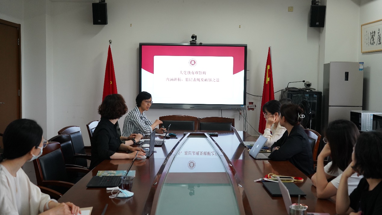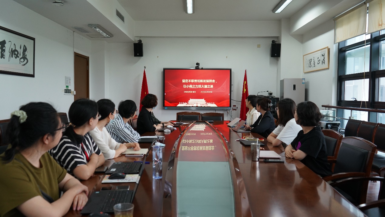 行政党支部书记陈琴以“坚定不移贯彻新发展理念,以小我之劳筑大国之基”为题,和支部党员们一起深入学习新发展理念内涵及其蕴含的战略意义,同时号召党员教师要联系实际,在新发展理念的科学指引下,结合岗位开拓进取,取得实效。依托外语学科基础和特色,在服务科技创新、人才培养,对接国家建设方面深入思考,勇担使命,为构建新发展格局贡献党员应有的力量。