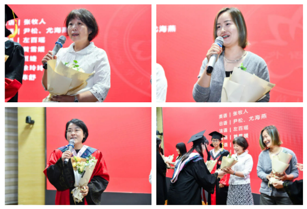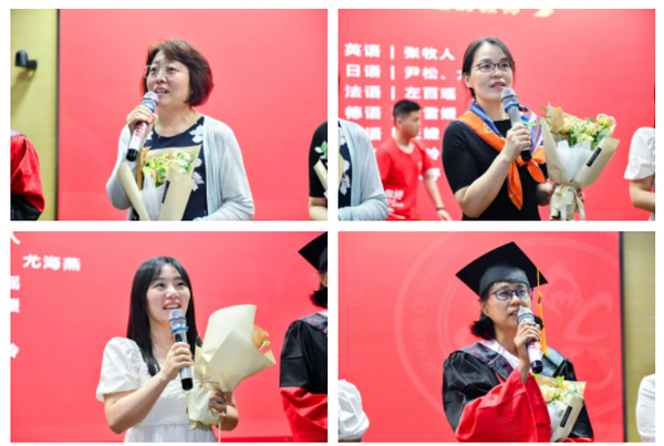 英语专业本科生郭晨语、俄语专业本科生王希芝、日语语言文学专业硕士研究生邓楚涵作为员工代表发言。