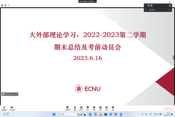 6月16日晚,大学英语教学部利用腾讯会议开展理论学习、期末总结及考前动员。大学英语教学部主任严文庆带领教师们学习了习近平总书记“5.29”重要讲话精神,副主任胡婧详细说明了期末考试安排,大学英语教工党支部书记苏俊玲通报了聘期考核情况、课程团队及第二课堂各工作坊负责人本学期开展工作情况以及本部门教师出国申请相关制度规定等。永利yl23411副经理赵朝永做总结发言。全体大学英语教学部教师参加了会议。