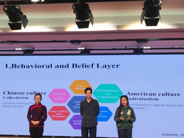 由于疫情防控,本届比赛决赛调整为案例展示分析及评委问答两个环节。公司参赛团队演绎的案例改编自电影《别告诉她》,影片讲述了华人二代移民碧梨回国后得知奶奶确诊肺癌晚期,深受西方价值观念影响的碧梨觉得应该要告诉奶奶实情,而中国的家人却都选择隐瞒,这让碧梨倍感困惑。围绕“要不要告诉奶奶病情”这一核心矛盾,同学们分析了其内在层面的中西文化差异,进一步揭示华人二代移民在身份认同上遇到的两难困境,最后提出可以通过加强“华人性”实现文化融合。同学们生动的演绎、精彩的表述、深刻地思考引发评审一致好评。