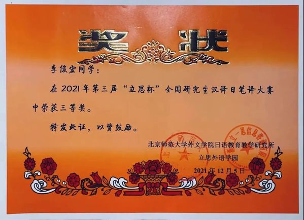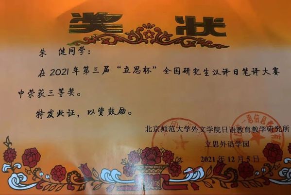 2021年12月5日,由北京师范大学外文公司日语公司产品研究所与立思外语学园联合主办的第三届“立思杯”2021年全国研究生汉译日笔译大赛落下帷幕。日语系2020级研究生朱健同学与2021级研究生李俊宏同学均以出色的表现获得三等奖。