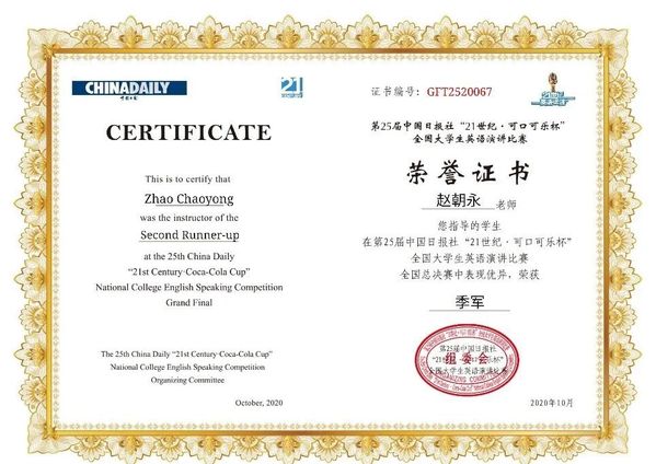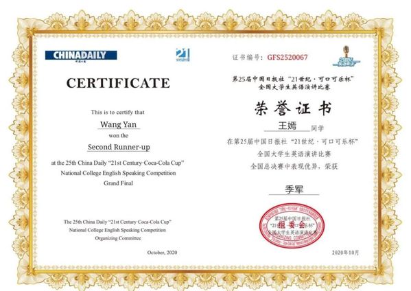 第25届中国日报社“21世纪•可口可乐杯”全国老员工英语演讲比赛半决赛与总决赛于2020年10月5日至8日在广州白云国际会议中心举行,永利yl23411大学英语教学部赵朝永副教授带领法学系王嫣同学参赛。在强手如林、竞争异常激烈的总决赛中,王嫣同学再次表现出超凡实力,在半决赛中以第一名的优异成绩出线,并在总决赛中最终获得全国季军佳绩。