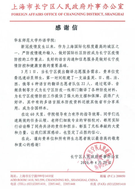 徐泉老师翻译的文件原本及郑菁菁老师参加的长宁区翻译实践团队感谢信