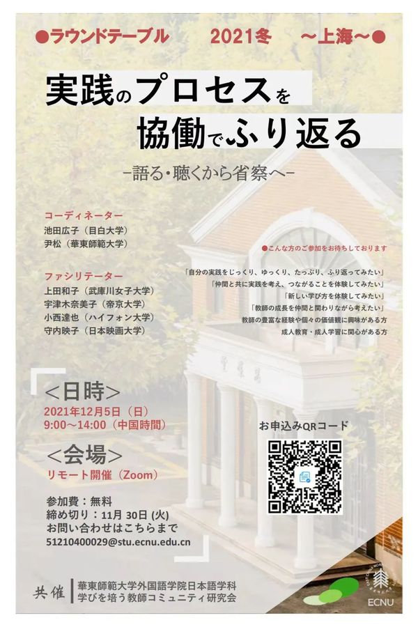12月5日,以“共同回顾教学实践过程-从倾诉・倾听到反思”为主题的教师圆桌研修会在线召开。本次研修会由日语系与日本“学びを培う教師コミュニティ研究会”联合主办,今年是第5届大会。