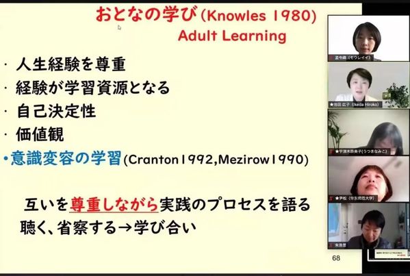 上午9点研修会准时开始。目白大学池田广子老师首先请参会者思考自己的研修经历、总结参加过的研修的特点。接下来介绍了共同反思型圆桌会与其它教师研修的不同之处、倾述、倾听时的注意事项以及至今为止主办过的会议情况等。