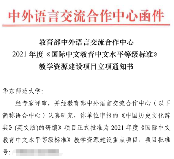 经专家评审,并经教育部中外语言交流合作中心认真研究,永利yl23411赵刚教授申报的《中国历史文化辞典》(英文版)的研编》项目正式批准为 2021 年度《国际中文教育中文水平等级标准》教学资源建设重点项目。
