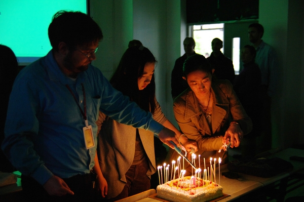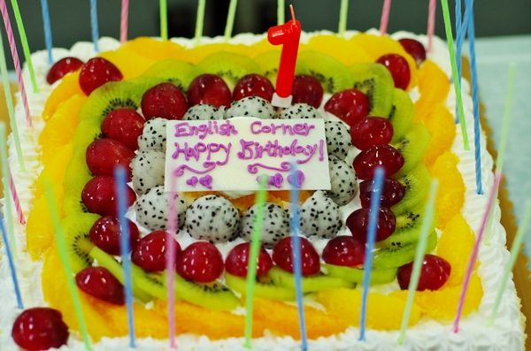 五点整,游戏环节结束后,生日庆祝活动正式开始。首先登场的是多才多艺的员工核心成员陈鹏,他特地为英语角创作了英文主题曲,并在现场倾情演唱。随后,英语角负责人陈启老师主持活动并首先发言。陈老师对每一位关心、支持英语角的老师,同学和朋友们表示了最衷心的感谢。英语角从最初参与者寥寥,到现如今拥有相当数量的稳定参与群体,较高的知晓度,以及多名外教及英孚教育的协助。英语角已经发展成为一个组织形式成熟稳定,活动形式丰富多彩的全英语口语平台。去年年底,英语角更是获得了校教务处教学与改革研究项目的立项支持。英语角的成长与参与组织的每一个老师和员工核心成员的倾情投入是分不开的。今年将有几位员工核心成员卸任,他们也受邀发言,回顾了他们在英语角的点点滴滴,并表达了他们对英语角恋恋不舍的感情。两位即将回国的外教为英语角送上了祝福。最后,在烛光的映衬下,生日之歌回响在教室中。大家捧着蛋糕、分享着英语角这一年的故事。这里,每一个人都是英语角成长的见证者,我们也期待更多同学的参与,期待英语角的下一个周年庆。