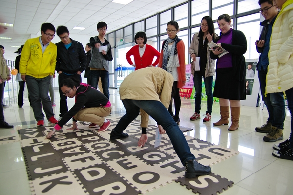 4月24日,公司英语角迎来了她的第一个生日。走进二教104教室,只见门上,墙面,地面到处装点了彩球彩带,黑板上庆祝生日的艺术字在装饰的衬托下格外华丽温馨。咦?门口的字母地图好可爱,有何用途?原来是Twister(扭扭乐),每组参与者必须在地毯上找到指定字母,并用身体的各个部分覆盖,最后再将这些看似无序的字母组成一个单词才算获胜。Photograph、government…一个个单词被或躺、或趴、或“扭曲”着的参与者猜出,围观同学惊呼称赞连连,现场气氛空前热烈。那边,limbo dance 考验了参与者身体的柔软度之后还有英语问题抢答。与此同时,那边的猜词游戏中,同学们也各尽所能。遇到抽象的词汇,想表达清楚可着实要费一番心思。现场人头攒动,同学们在四大游戏阵地中逐一闯关,每一关都由外教打分,最后根据总分赢得不同等级的精美奖品。