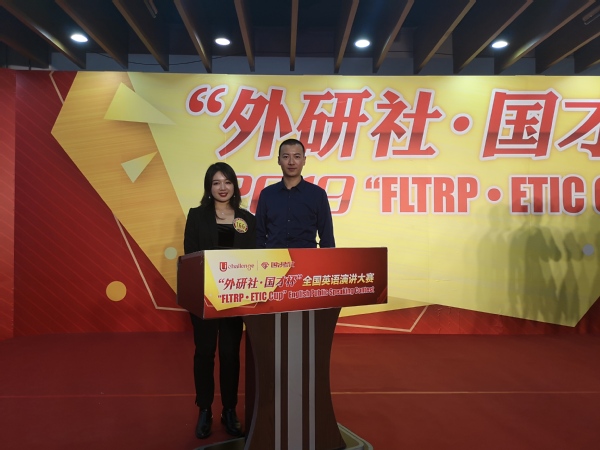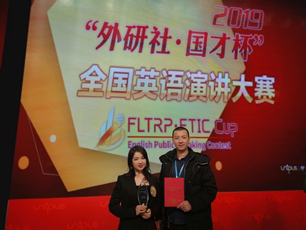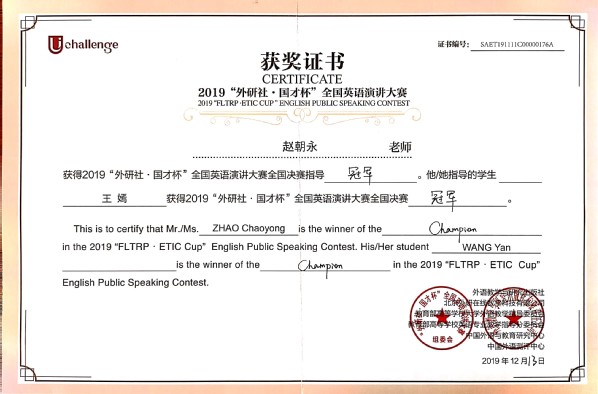 2019年12月9-13日,“外研社·国才杯”全国英语演讲大赛(“FLTRP·ETIC Cup” English Public Speaking Contest)在北京外研社国际会议中心隆重举行,共有来自全国180名选手同台竞技。在历时五天、鏖战四轮之后,公司永利yl23411赵朝永副教授指导的2018级法学专业王嫣同学一路过关斩将、夺得本届大赛的全国总冠军,实现师大英语演讲比赛全国冠军为零的突破!