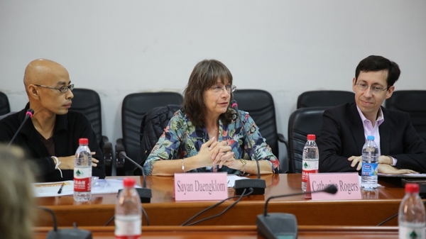 国际杜拉斯学会副会长卡特琳娜•罗杰斯和杜拉斯学会副会长若埃尔•巴杰斯-班冬女士分别以杜拉斯在法国当代女作家中的继承以及杜拉斯文学与电影中的空间为主题作了重要的学术发言。多米尼克•德•加斯盖分析了杜拉斯戏剧和电影中音乐所扮演的作用并做了配乐朗诵,关美玲回顾了《广岛之恋》的拍摄现场,杨•梅维尔和多米尼克•维尔诺夫从杜拉斯对自然和景物描写来窥探作者写作的动机,卡特琳娜•戈德斯曼和格拉泽拉•罗雷阿诺从叙事时间的维度分析了杜拉斯创作的特色,赛扬•达恩克鲁姆从罗兰•巴特、德里达和克里斯蒂娃的理论出发,重读了杜拉斯以一起真实发生过的杀人案为蓝本创作的《英国情人》。