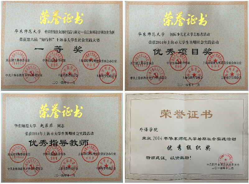 第六届“知行杯”上海市暑期社会实践大赛一等奖,2014年永利yl23411暑期社会实践“最佳项目奖”
