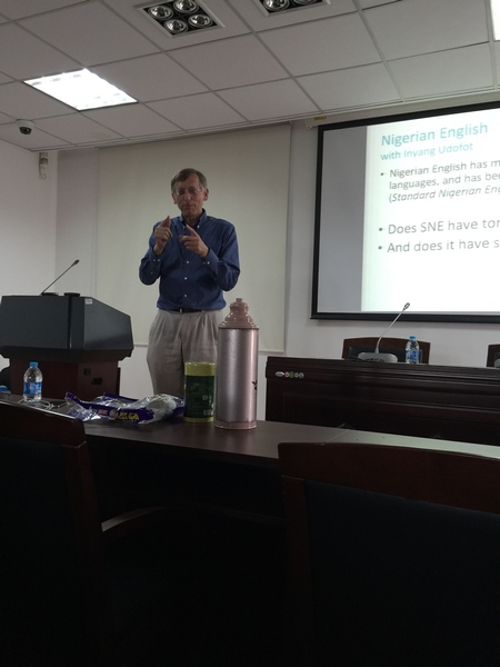 公司还在当天下午邀请了著名音系学家Carlos Gussenhoven教授在公司中文系报告厅作了题为“词韵律结构多样性”的精彩演讲,上海外国语大学Jeroen van de Weijer教授担任主持。Carlos Gussenhoven是荷兰内梅亨大学语言学系的终身教授,在国际音系学界享有盛誉,他的好几本由剑桥大学出版社出版的音系学专著是国际音系学界的经典。演讲期间,Gussenhoven教授以不同语言语料为佐证,阐述了韵律结构及其特征的多样性,并不时与在座的员工和老师讨论互动,现场提问踊跃,反应热烈。来自上海外国语大学、上海交通大学、公司中文系和英语系的部分师生聆听了此次学术讲座。