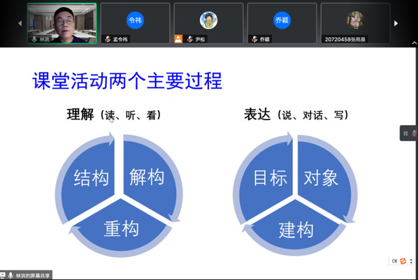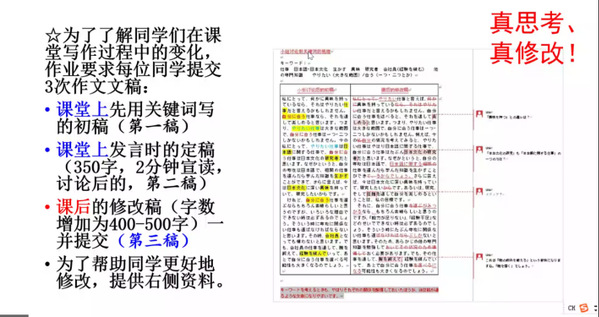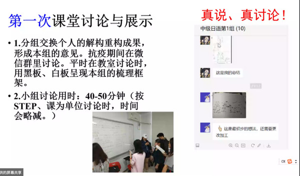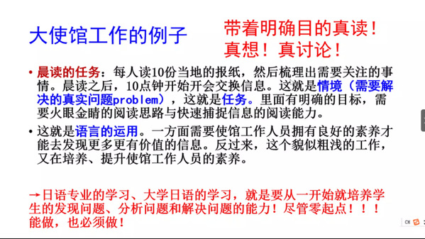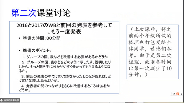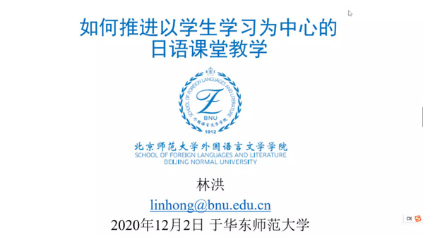 随后,林洪老师以《基础日语综合教程》2年级精读课程的课堂实践为例,向大家展示了如何组织课堂去有效推进“以员工学习为中心的日语课堂教学”。
