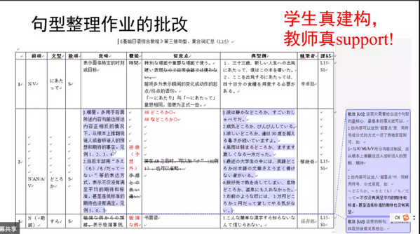 在文本解构与重构完成之后,组织同学分组自行梳理各课出现的语法和句型。在此过程中,林洪老师会为员工提供相应的工具和调查方法,由员工分组完成后共享给全体师生,教师批改以后形成梳理成果,并根据需要进行答疑。