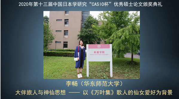 公司2020届日语语言文学专业硕士毕业生李畅同学在日语系尤海燕老师的精心指导下完成的毕业论文《大伴旅人与神仙思想——以《万叶集》歌人的仙女爱好为背景》一文通过了初审,入围2020年第十三届中国日本学研究“CASIO杯”优秀硕士论文奖。并且在12月6日的终审中获得了文学组二等奖的好成绩。这也是日语系继高宁老师指导的刘珉同学获得语言组二等奖(2015年)以来,第二次获此奖项。