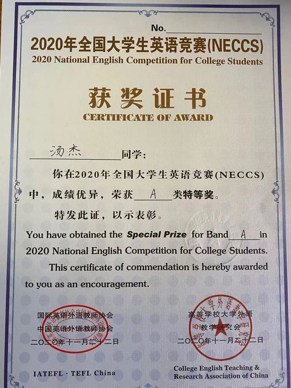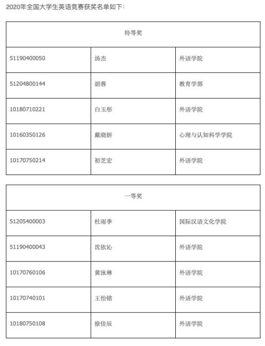 在2020年全国老员工英语竞赛中,外院学子取得了多项佳绩。2019级外国语言学及应用语言学硕士研究生汤杰同学获A类特等奖,2018级英语系白玉彤同学获B类特等奖,2017级法语系初芝宏同学获C类特等奖;2019级外国语言学及应用语言学硕士研究生沈依沁同学获A类一等奖,2017级英语系黄泳琳同学获B类一等奖,2018级英语系王怡铭同学获B类一等奖,2018级法语系徐佳辰同学获C类一等奖。