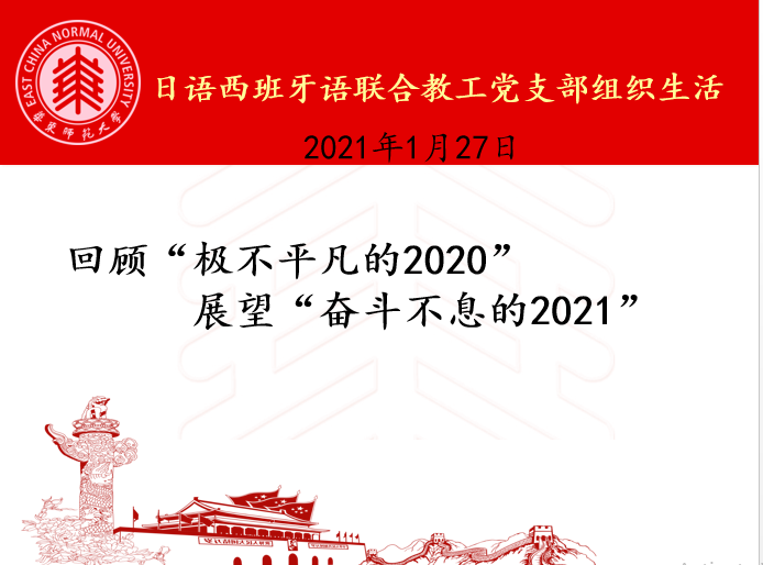 2021年1月27日星期三下午,日语西班牙语联合教工党支部举行了2021年第一次支部活动。此次支部活动的主题是“回顾与展望”,回顾“极不平凡的2020”,展望“奋斗不息的2021”。