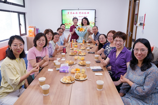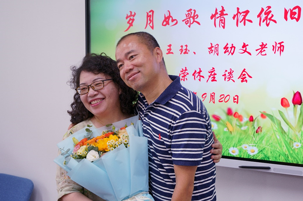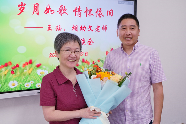 首先,工会主席苏俊玲致辞。她高度评价了王珏和胡幼文两位老师为大学英语教学部的发展所做出的重要贡献,赞扬了两位老师三十余年如一日兢兢业业,把青春和整个职业生涯都无私地奉献给了华东师大。同时,她衷心希望两位老师开启退休幸福新生活,也欢迎两位老师常回家看看,为大学英语教学部的工作献计献策。随后,大学英语教学部教师周小勇、郭忠义为王珏、胡幼文老师献上鲜花,表达对两位老师的美好祝愿。最后,大学英语教学部的教师代表们纷纷为两位老师送上了祝福,和两位老师共话在大学英语教学部共事几十年结成的深厚友谊,并拍照留念。