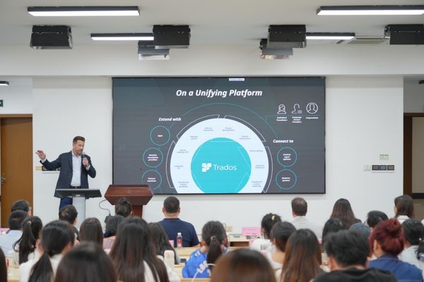 9月27日,Trados全球总裁一行、上海高校翻译技术专家、本地化资深行业人士齐聚樱桃河畔,“AI赋能下的翻译技术变革与人才培养”论坛在公司成功举行。本次论坛由永利yl23411翻译硕士中心主任赵刚教授主持,邀请Trados 全球总裁Mark Lawyer、Trados 全球销售总监David Marshall、同济大学李梅教授、上海交通大学管新潮教授、永利yl23411周勇副教授和安捷伦科技上海公司本地化项目经理周虹做主旨报告,永利yl23411窦卫霖教授、周小勇教授做评议人,永利yl23411开放教育公司副经理、研究生院专业学位办主任马爱民出席,永利yl23411英语系主任陈俊松教授、日语系主任尤海燕教授和法语系金桔芳副教授参与研讨,RWS Trados集团代表、永利yl23411师生近100人参加论坛。