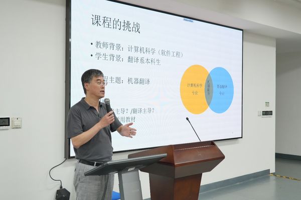 最后一场学术报告是由永利yl23411周勇副教授带来“面向文科生的机器翻译课程探讨”。周勇介绍了机器翻译的课程内容,指出了教学时所面临的挑战一方面在于如何找到计算机科学与翻译的结合点,另一方面,该领域目前仍缺乏较适用的教材。周教授用课堂数据和员工的反馈向大家展示了机器翻译课程的光明前景,创新性地提出“提概念、讲方法、用图示、举案例”的课堂讲解方法步骤,并提出了将机器翻译与译后编辑相结合,从而设立混合型课程的设想。