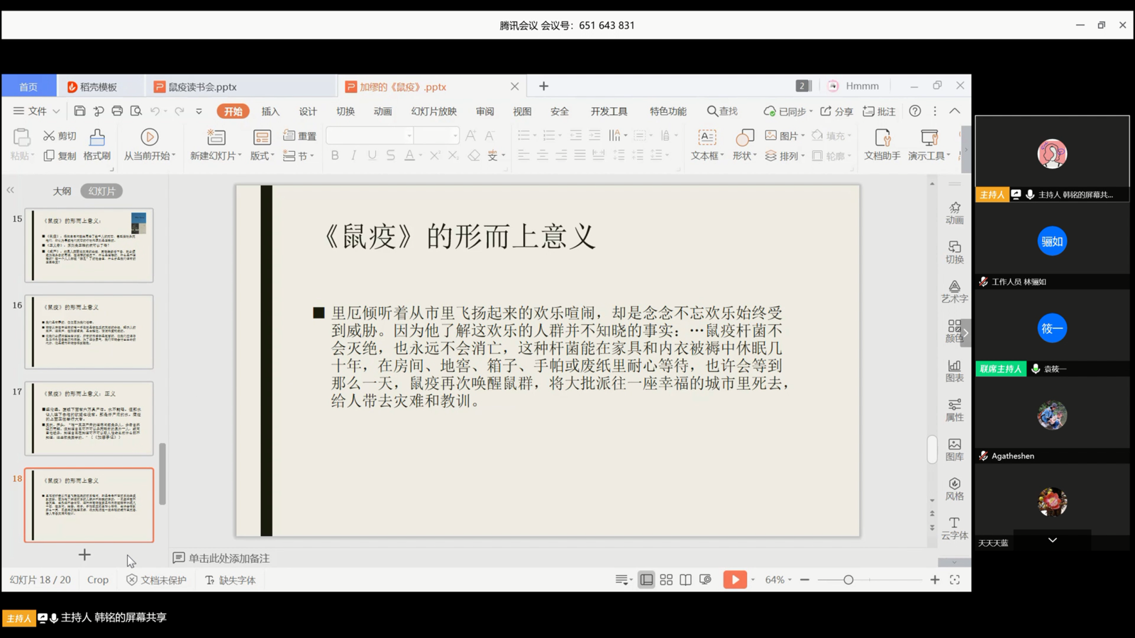 2020年4月3日晚18时30分,公司举办“2020永利yl23411经典系列阅读活动之《鼠疫》”,本次线上读书会由永利yl23411员工会承办。永利yl23411经理、法语系教授袁筱一老师受邀做了题为“为什么我们今天还会读《鼠疫》”的讲座,与196名师生一同探讨了《鼠疫》这部文学作品的意义。