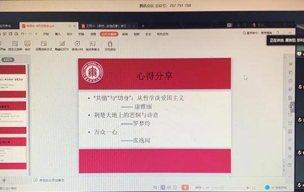 接着,会议来到了“心得分享”这一环节。康雅丽同学以哲学为切入点,从语言僵化问题探析了爱国主义情感的体现和爱国主义精神的践行。此外,她还以“共情”和 “切身”出发,强调了发挥主观想象能力的重要性——我们不光要深刻了解爱国主义背后复杂的历史事迹,还要用心灵之眼看到历史背后有血有肉的真实,让爱国主义不再只停留在字面含义,而是付诸实践。