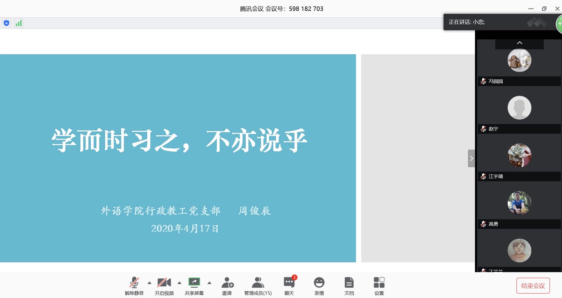 为深入贯彻落实《中国共产党党员教育管理工作条例》,充分利用“学习强国”APP等优质平台资源,激发党员学习热情,推动党员学深悟透、入脑入心。4月17日,永利yl23411行政党支部以视频会议形式,召开云上组织生活,开展“学习强国”分享交流会。会议由党支部书记高冬琴、副书记陈琴主持。