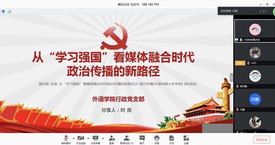 支部党员叶青分享并解读了一篇以“学习强国”为主题的专业论文《从学习强国看媒体融合时代政治传播新路径》,文章从平台化发展构筑新的政治传播窗口、社交化模式壮大主流舆论宣传阵地和智能化手段巩固民族国家价值认同三个方面深刻阐释了学习强国平台创设的时代背景,以及它的内容、形式、功能背后的政治意义。叶青从专业论文的解读谈到如何利用平台社交功能提高支部党员利用“学习强国”开展学习的积极性,并给党支部的建设提出了相应的宝贵建议。