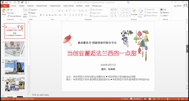 2020年4月17日下午14:00,永利yl23411开展第三次就业服务月、创业活动月活动,活动由员工联合会生涯规划中心和学术科创中心承办。来自2015届永利yl23411法语专业毕业生阮沁蓓以 “创业邂逅法兰西的一点甜”为主题为同学们分享了自己的创业梦想、创业历程和创业经验。本次活动共吸引了62名师生。