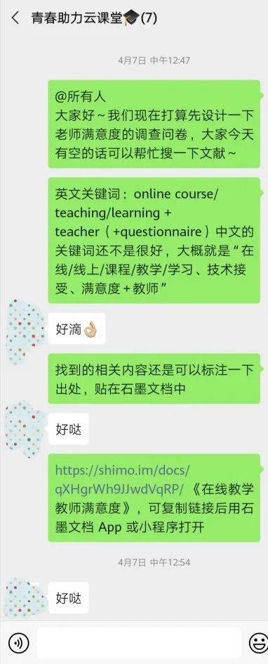 在这个特殊时期,项目组成员通过微信群、腾讯会议进行沟通交流,及时推进项目进度及研究安排,并通过石墨文档共享资料,线上协作完成申请表撰写、问卷设计等任务。