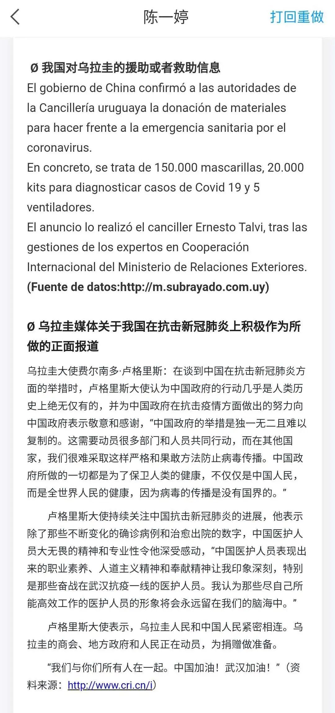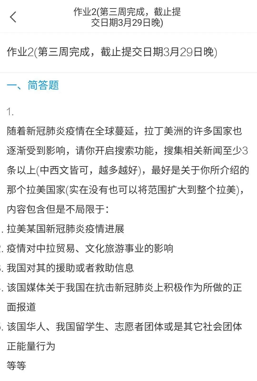 课程运行至今,最受同学们欢迎的当属第三周的作业。因为疫情在世界各地蔓延,我要求大家收集和拉丁美洲疫情相关的新闻,尤其是我国各阶层对该国所做的援助或者合作,包括该国媒体对我国在抗疫斗争上的积极作为的正面报道等。希望不仅能够培养员工们的信息检索能力,使他们对拉美地区的热点动态更为了解,更能够明确自己的立场,提高思辨能力。员工们纷纷表示这一“新闻采集员”的工作有着十分积极的意义,这使他们不仅能够直面疫情对拉美诸多国家所产生的影响,更能见证了我国上上下下在全球范围内为抗击新冠肺炎所做出的积极贡献。