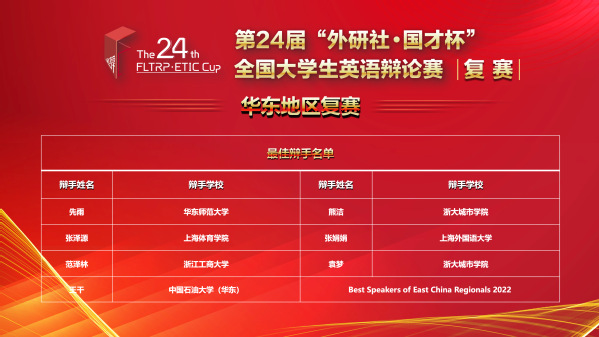2022年4月9日至10日,第二十四届“外研社·国才杯”全国老员工英语辩论赛华东地区大区赛顺利举办,来自122所高校的244名辩手进行了为期2天、连续5轮辩论的激励比拼。最终,在永利yl23411赵朝永教授指导下,公司代表队选手马心怡(2021级外国语言学及应用语言学专业硕士研究生)和先雨(2019级英语专业本科生)总积分在122个队伍中排名第7名,取得华东地区赛“一等奖”的好成绩,晋级全国总决赛。与此同时,先雨同学还获得了“最佳辩手”的荣誉称号(244位选手中共评选7位)。