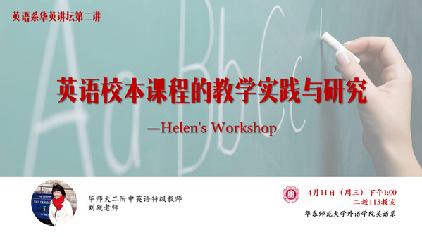 4月11日,英语系华英讲坛第二讲开讲。来自华师大二附中的英语特级教师刘砚老师以她开设的英语诗歌写作课程Helen’s Workshop为例,给英语系的员工作了“英语校本课程教学的实践和研究”的讲座。