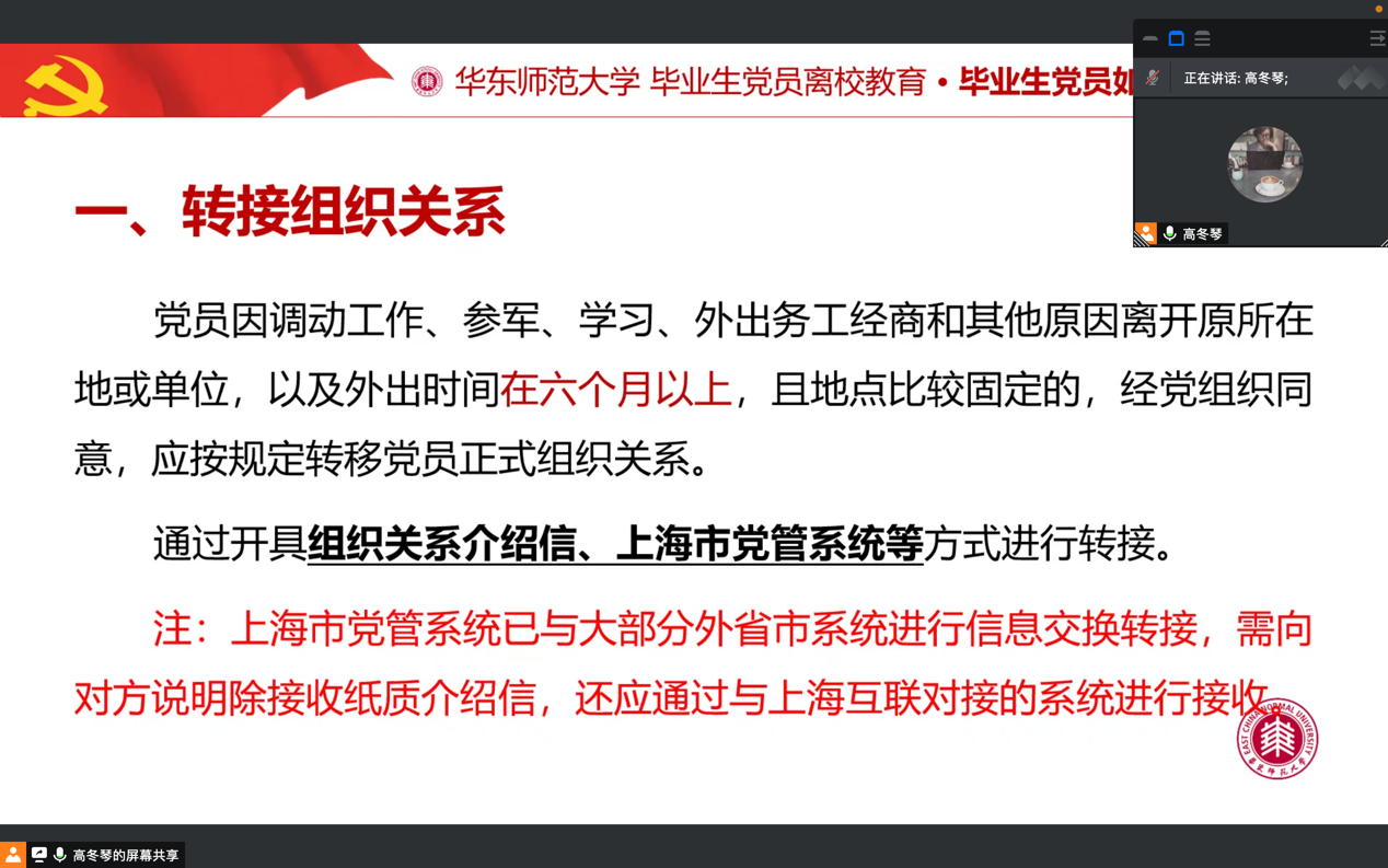 最后,公司党委委员、专职组织员高冬琴详细介绍了毕业生党员转接组织关系的具体要求,并强调及时完成组织关系转接的重要性。她向毕业生党员讲明离校后转移组织关系应该注意什么,应该怎么做,帮助毕业生党员提高思想认识,解决实际问题。她希望毕业生党员坚持以习近平新时代中国特色社会主义思想为指导,尊崇党章、遵守党规,在走上工作岗位后继续发挥好党员的先锋模范作用,报效祖国、服务社会,在实现中国梦的生动实践中放飞青春梦想。