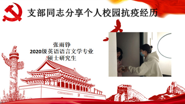 党支部书记金晶在总结中表示,支部党员勇担志愿责任,不畏艰险、冲锋在前、顽强拼搏,值得学习和赞赏。希望支部党员继续积极为疫情防控出力献策,合理利用时间,在不懈学习中完善自我。她强调,要牢记总书记对青年的寄语,在这个继往开来的新时代,创造出属于这个时代的辉煌,让革命薪火代代相传!