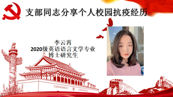 首先,顾世一同志带领支部党员深入学习了习近平总书记在庆祝中国共产主义青年团成立100周年大会、在中国人民大学考察时的重要讲话精神。总书记强调,新时代的中国青年,要更加自信自强、富于思辨精神,用青春的智慧和汗水打拼出一个更加美好的中国。希望全国广大青年牢记党的教诲,立志民族复兴,不负韶华,不负时代,不负人民,在青春的赛道上奋力奔跑,争取跑出当代青年的最好成绩。结合总书记讲话精神及校园防疫现状,张雨铮、李云霄两位同志分享了她们担任校园防疫志愿者的经历和感想。