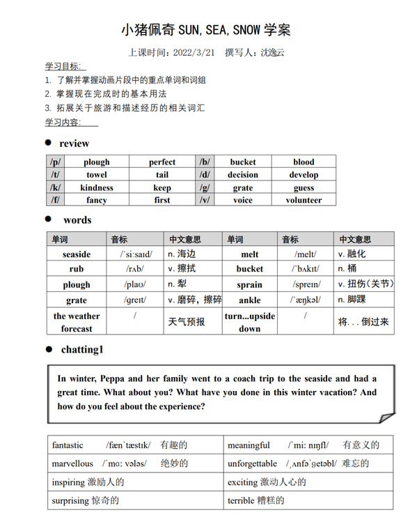 在前几轮支教内容的基础上,本学期教学计划紧抓课本知识点巩固,结合课外知识拓展,综合教学计划安排,内含语法知识,词汇搭配,音标复习和口语练习,旨在全方面发展员工的英语水平。尤其在口语方面,力求以听促说,以读促说,争取提升当地员工的口语表达能力。