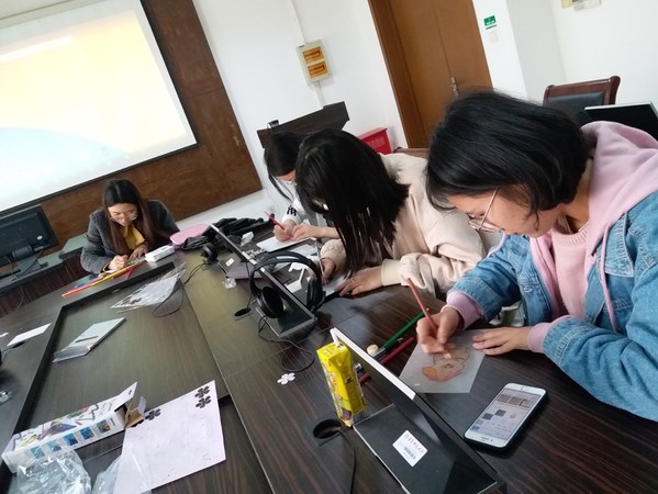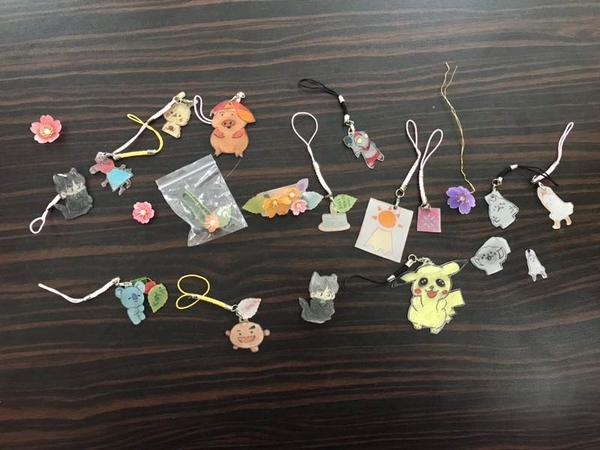 制作过程中,同志们先在材料纸上画出图案,上色,将图案剪下来。然后经过热风枪的烘干定型,使热缩片基本成型,再通过压制固定,最后用装饰材料加以点缀,就大功告成了。以下是同志们的成果展示。