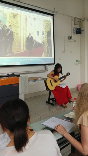 第二个赛段是俄译汉、汉译俄。第三个赛段则让选手们进行才艺展示,其中还有选手自带乐器进弹唱演出。