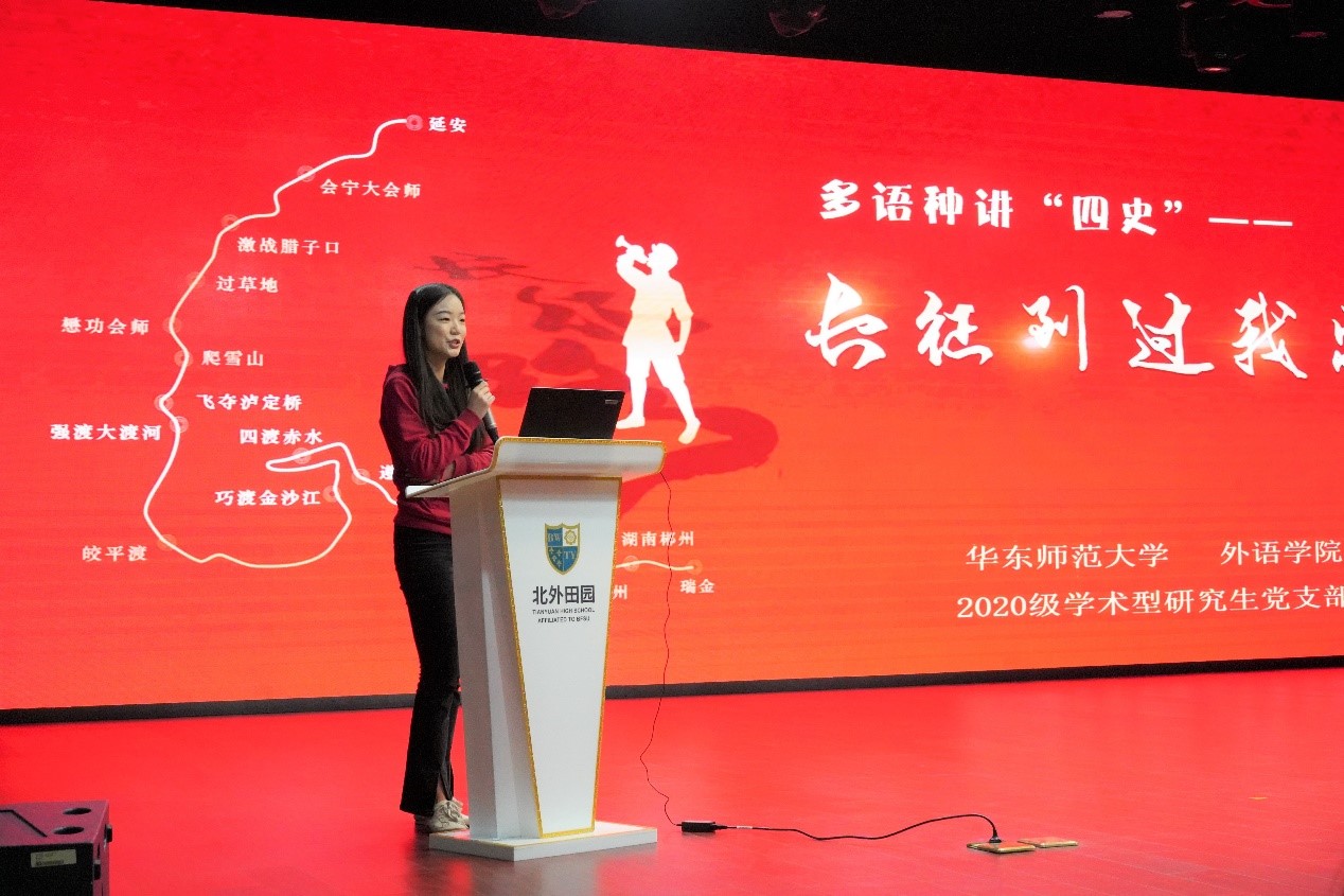 丁惠雅是永利yl23411多语种员工党史宣讲团的一员。这支团队由2020级学术型研究生党支部党员及本科生联合组成,在公司党委的指导下,团队以专业优势和青春力量学习和发扬党史,让原创多语种党史学习教育资源走进中学。4月16日,宣讲团四名成员在公司党委副书记兼副经理江宇靖,2020级学术型研究生党支部书记、日语系教师金晶,永利yl23411团委书记周俊辰的带领下,走进北京外国语大学附属上海田园高级中学,以“长征到过我家乡”为主题,为选修日语、法语、德语、西班牙语的四个小语种的350余名高一员工讲述长征故事,教授外语专业知识。活动由2020级学术型研究生党支部副书记李梦婕主持,田园高中董事长陆振权、教学发展中心主任屠文娟对宣讲团一行的到来表示热烈欢迎。