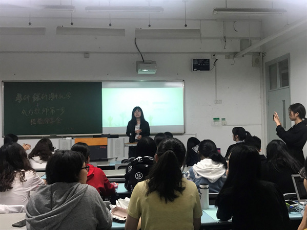 2017级英语笔译专业研究生李舒昆为同学们带来了第二场经验分享——“成为教师第一步”,围绕教师职业规划提供了许多宝贵的信息。李舒昆逐条分析了教师职业的工资待遇、福利待遇、职业压力与工作时长。她用真实的数据,说明了长三角地区详细的教师就业情况。之后,李舒昆以自己的求职经历为例,梳理了毕业生走上教师岗位的流程。其中,李舒昆尤其强调教育实习、教团队格证、简历制作的重要性,最后传授了一些非常实用的求职技巧与经验。