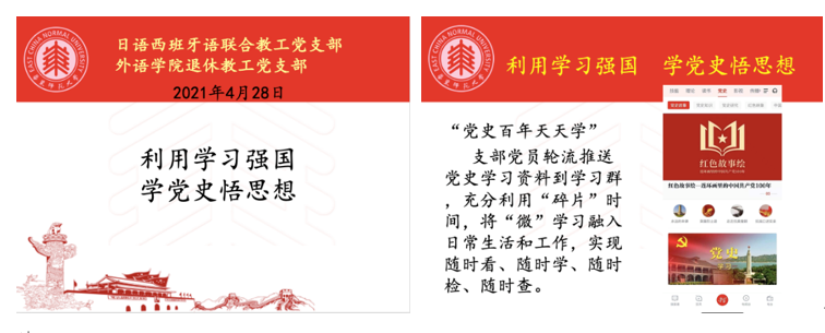 作为献礼中国共产党建党100周年的活动之一,2021年4月28日下午,日语西班牙语教工党支部联合永利yl23411退休党支部开展主题党日活动,主题是“利用学习强国,学党史悟思想”。会议由日西支部书记陈凌虹主持,共25名支部党员参加。