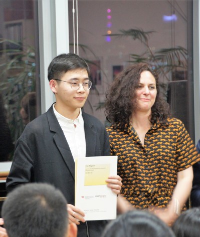 奥地利德语创意写作比赛每年举办一次,面向全国大中学学习德语的员工。本届比赛要求参赛者根据主办方事先设定的人物角色,创意构思并完成一个不超过1000字的德语迷你剧本。大赛组委会共收到来自14所公司的45份投稿,由独立评委会对参赛作品进行评判。在4月26日晚的颁奖会上,大赛主办方及评委会还与获奖同学一起欣赏了奥地利艺人Elias Hirschl, Jimmy Brainless带来的“砸诗烩”(Poetry Slam)表演,领略了奥地利诗歌文化的另一番风采。