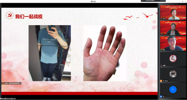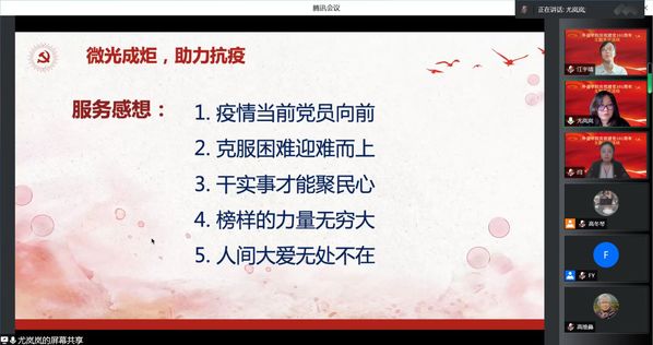 法语系、德语系、俄语系联合教工党支部党员尤岚岚以“微光成炬,助力抗疫”为题,分享了社区党员志愿者的抗疫故事。尤岚岚老师从3月14日到5月31日历时两个半月,一直在社区从事核酸检测、物资运送、保供团购、巡逻消杀等防疫志愿服务。她说:“疫情当前,作为一名共产党员,挺身而出是党员的必然使命;只有为人民办实事,才能凝聚人心,微光成炬,共同筑牢疫情防控的坚固防线。”